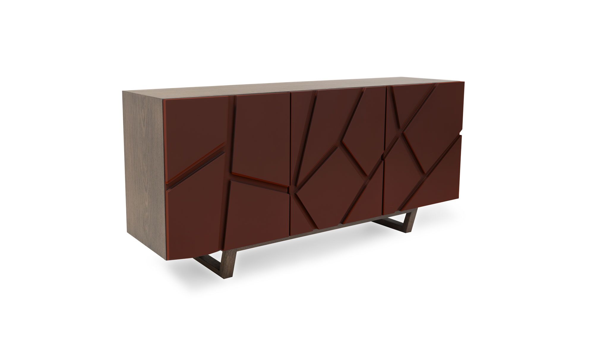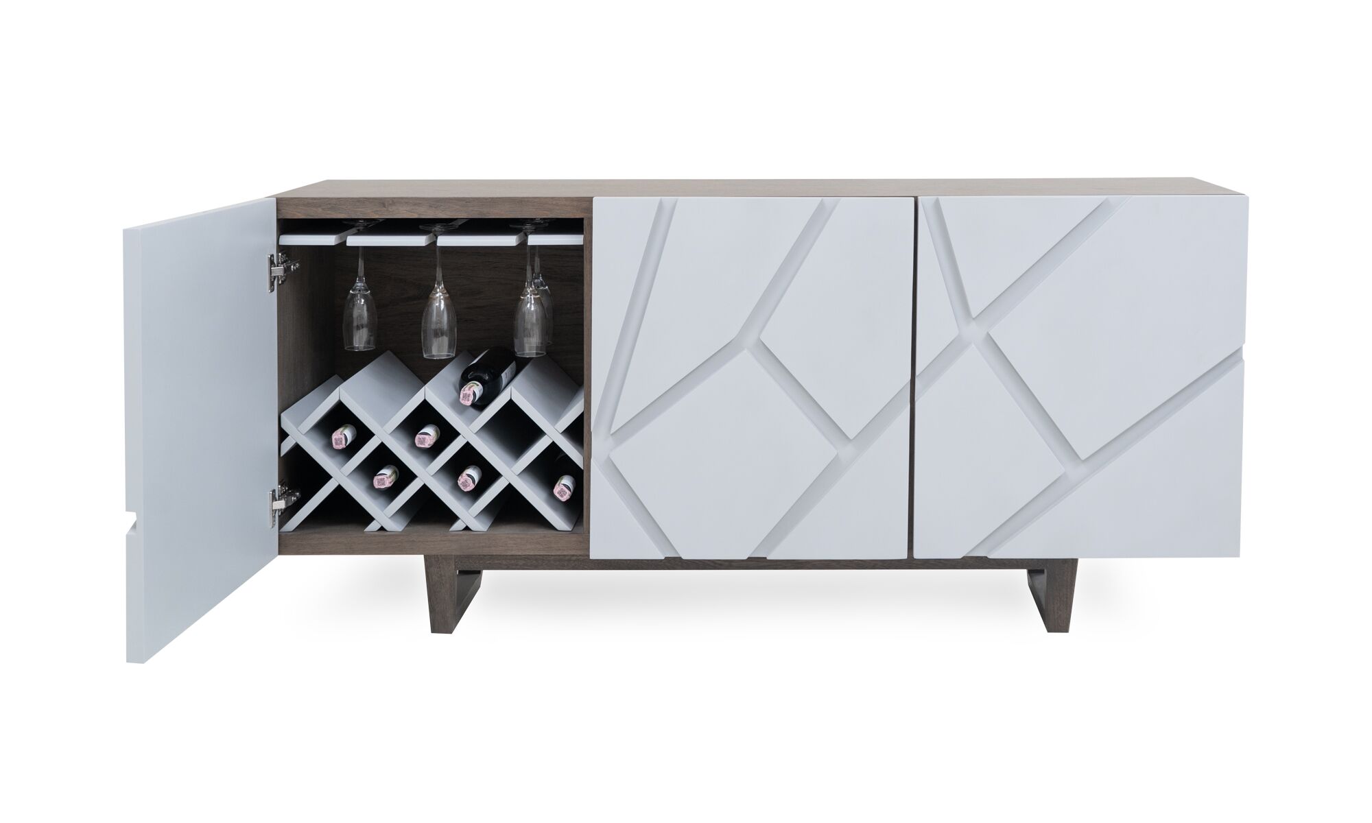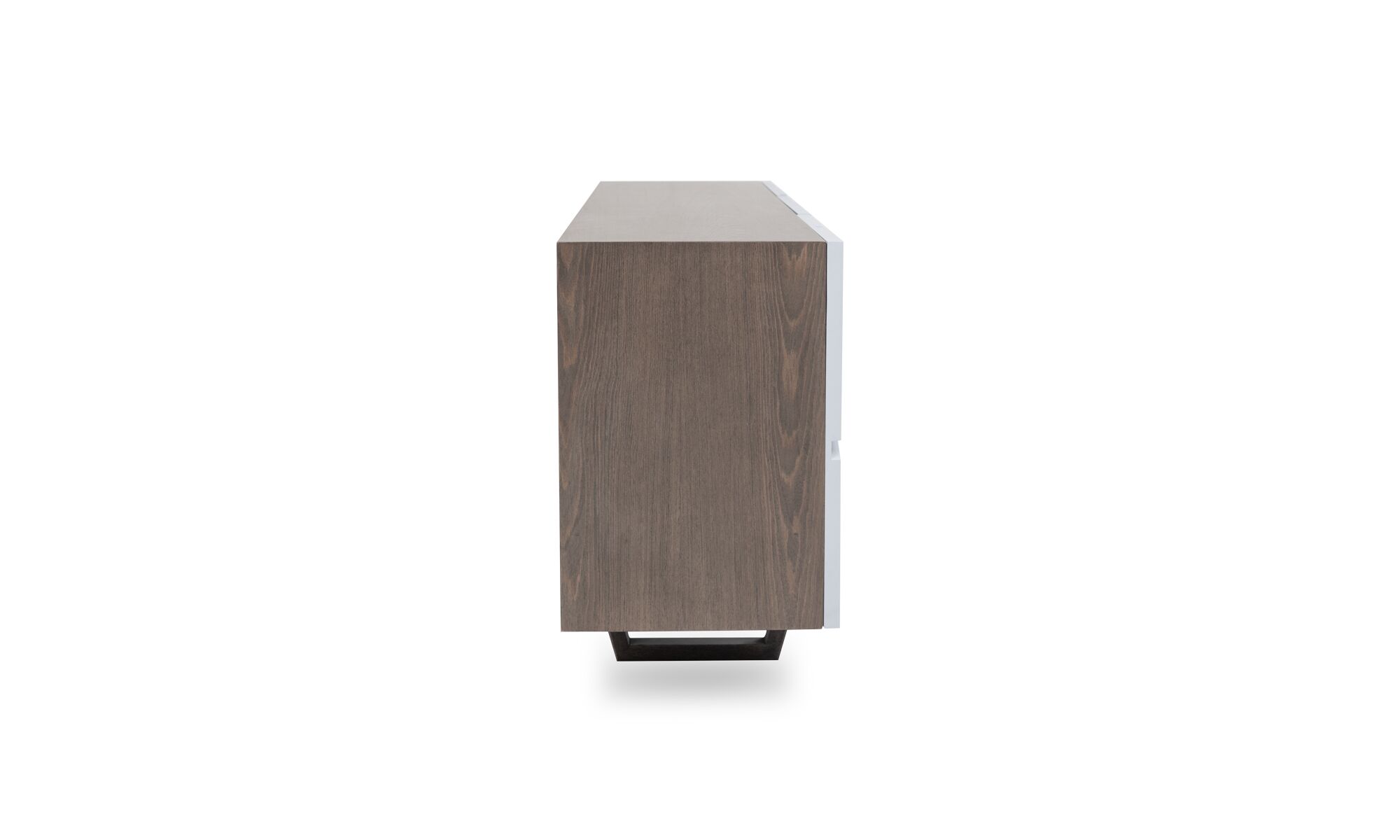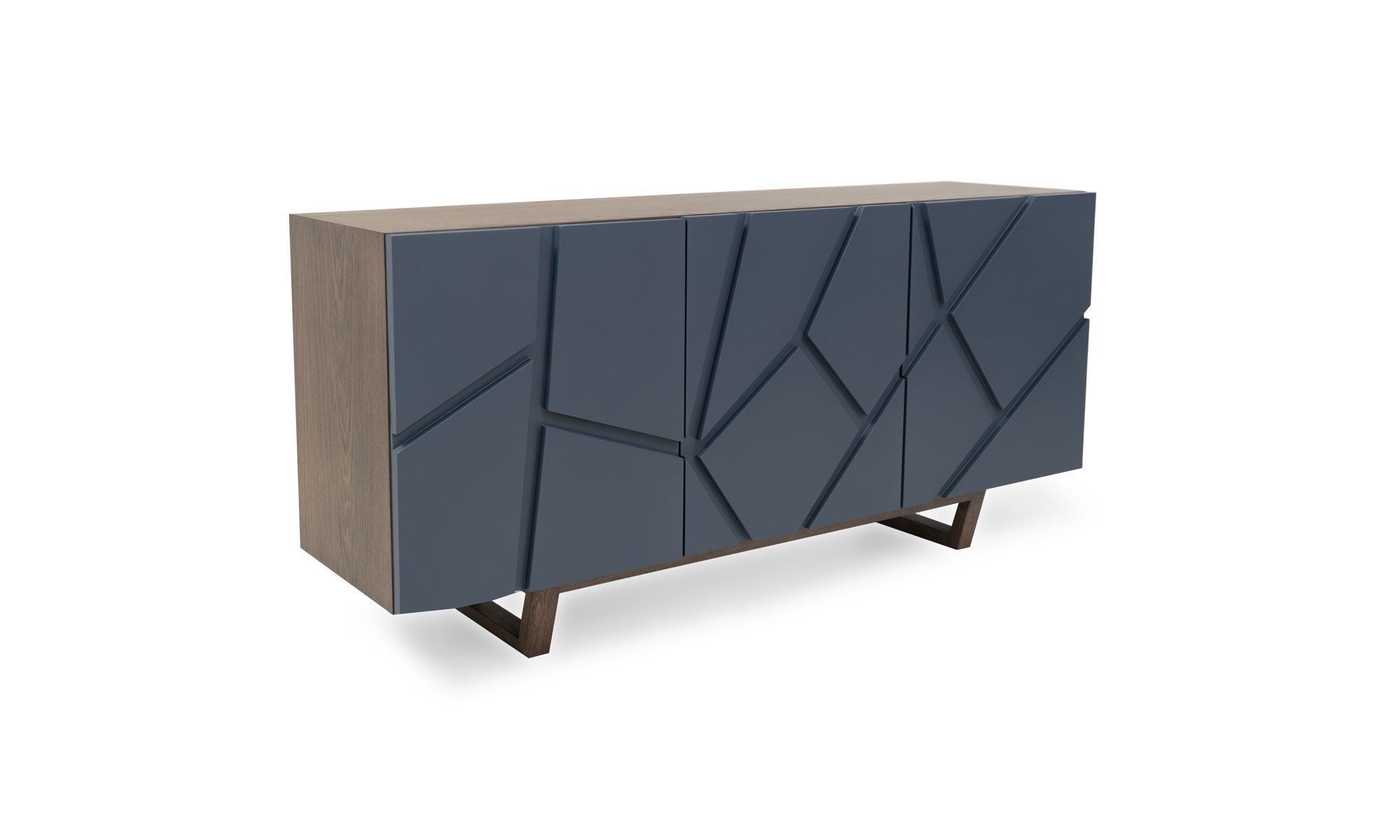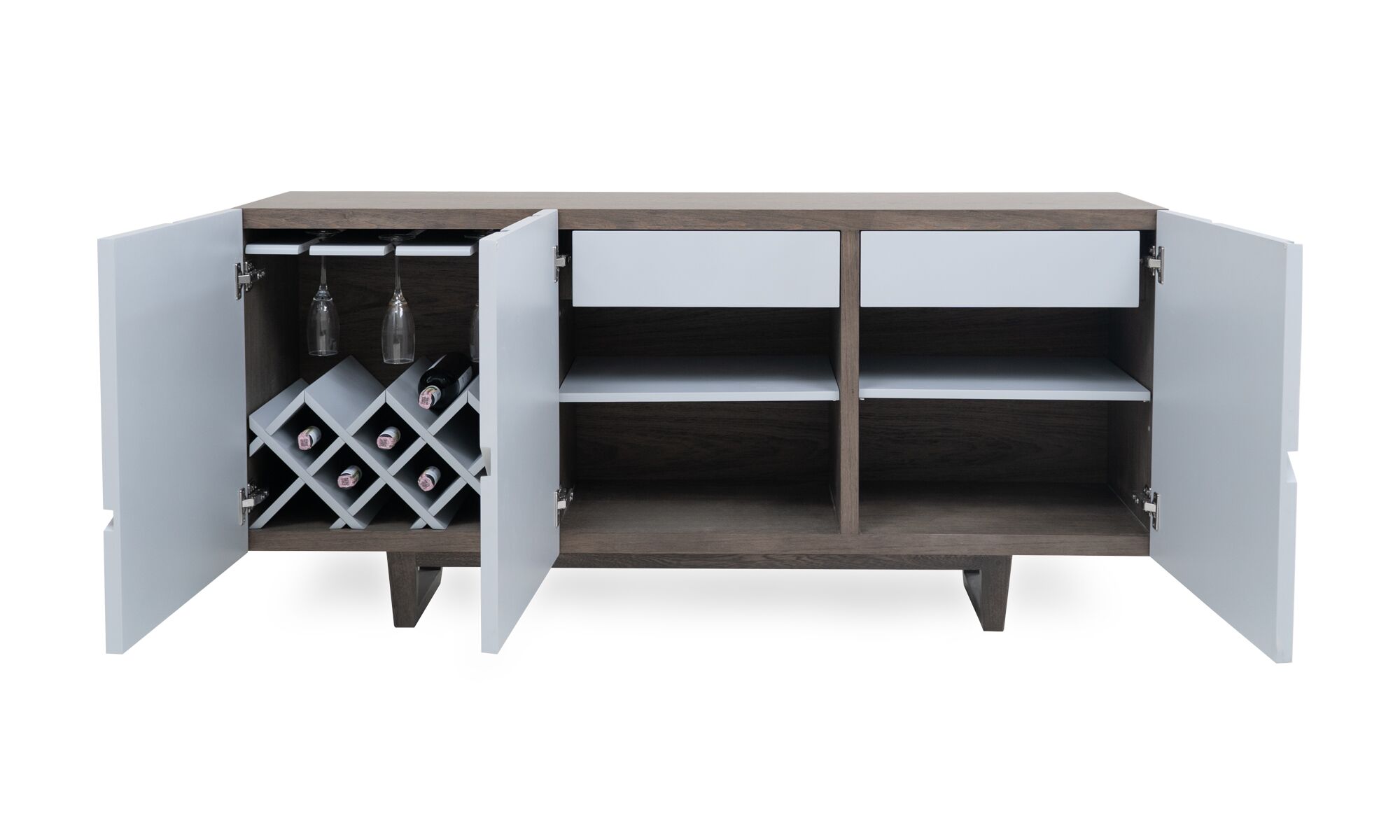 Vista frontal del Aparador Osaka Roble + Cava de Aristas. Este aparador destaca por su diseño contemporáneo, fabricado en roble europeo. Cuenta con puertas lisas sin tiradores visibles de color Mouse.