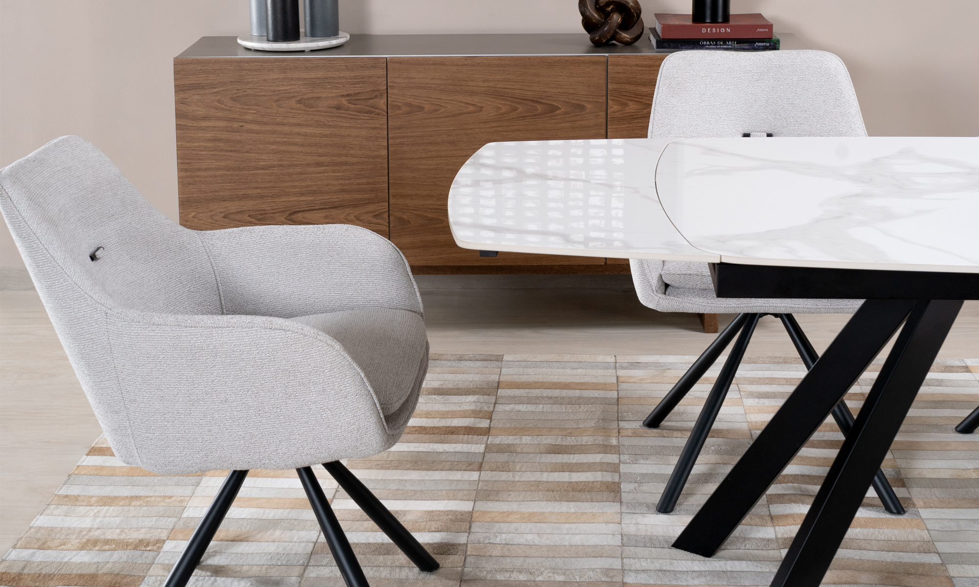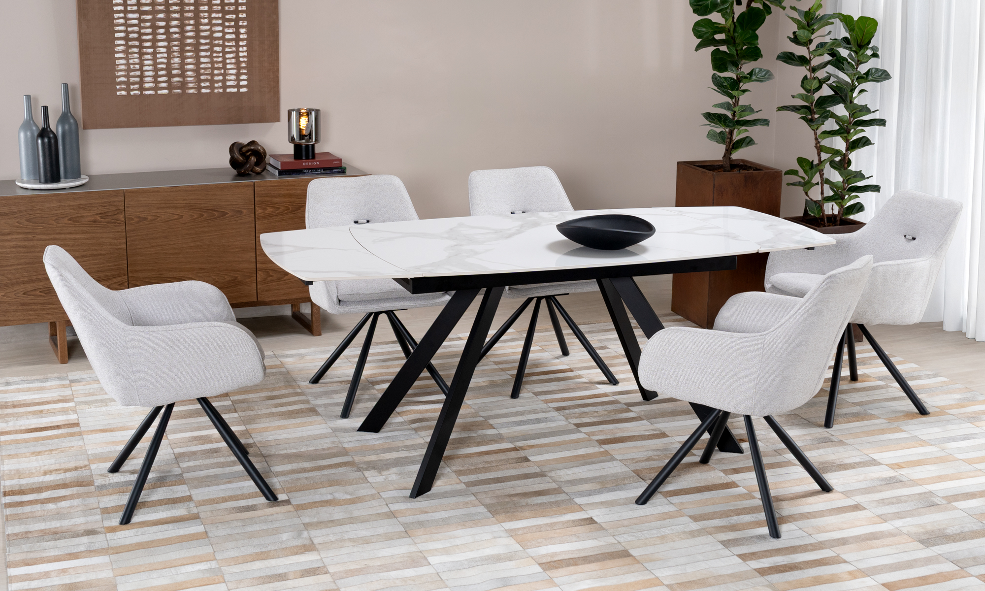 Combina diseño contemporáneo y funcionalidad inteligente. Sus líneas limpias y proporciones equilibradas se complementan con un sistema de extensión discreto, pensado para adaptarse con elegancia a cada ocasión.
