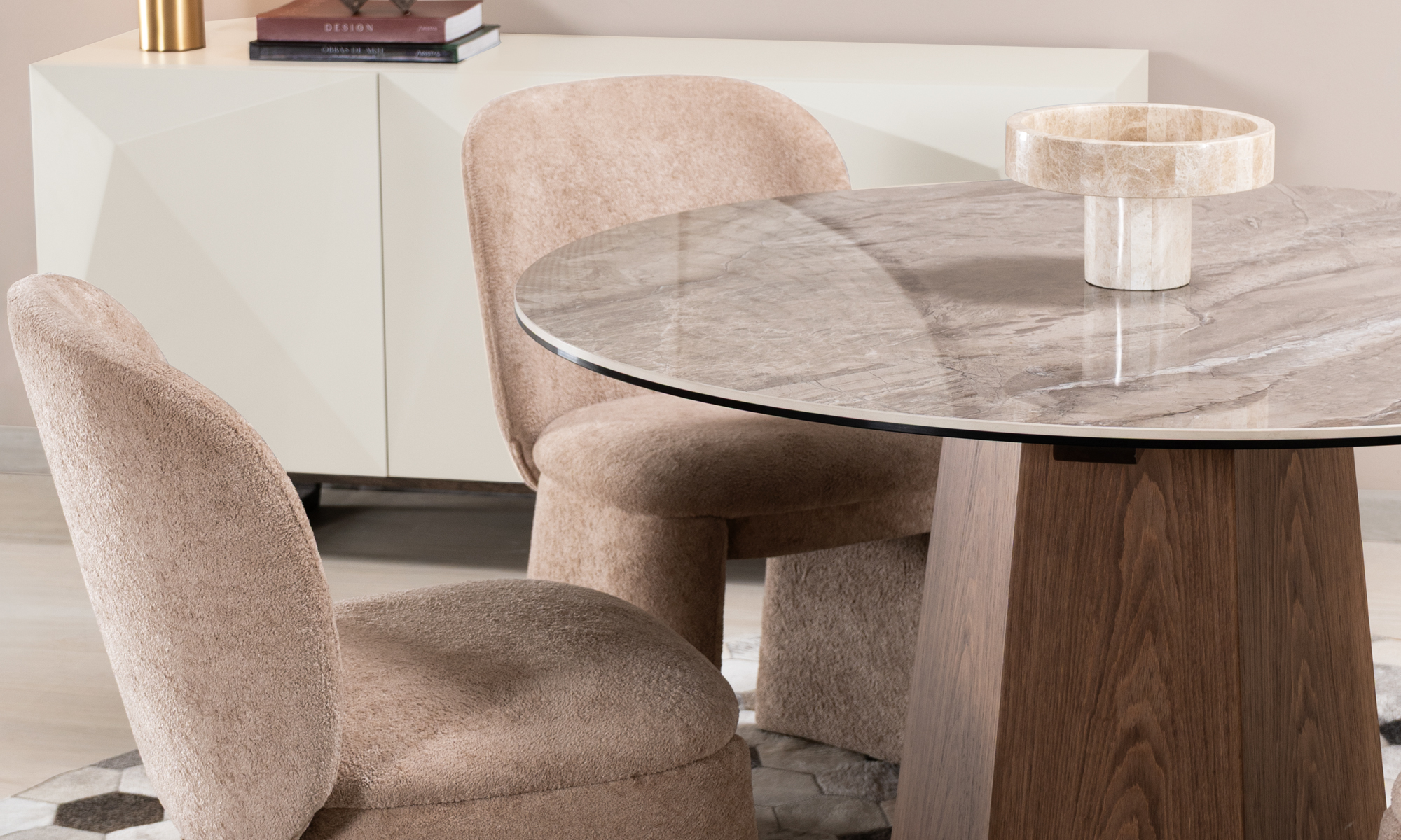 | Estructura | Base madera en flor morado / Tapa en cerámica sinterizada, con acabado mate y vetas naturales tipo mármol. |