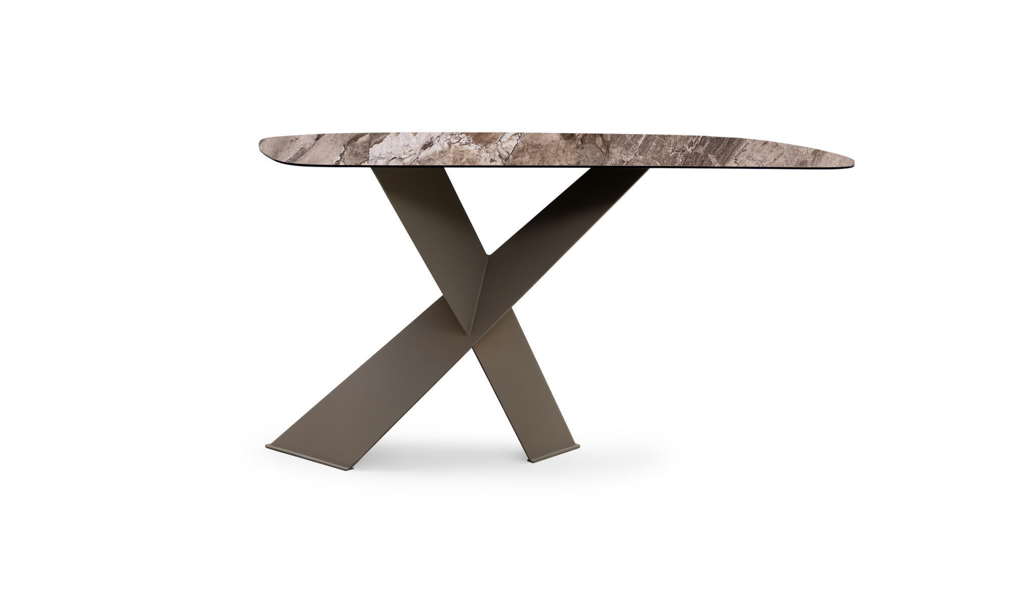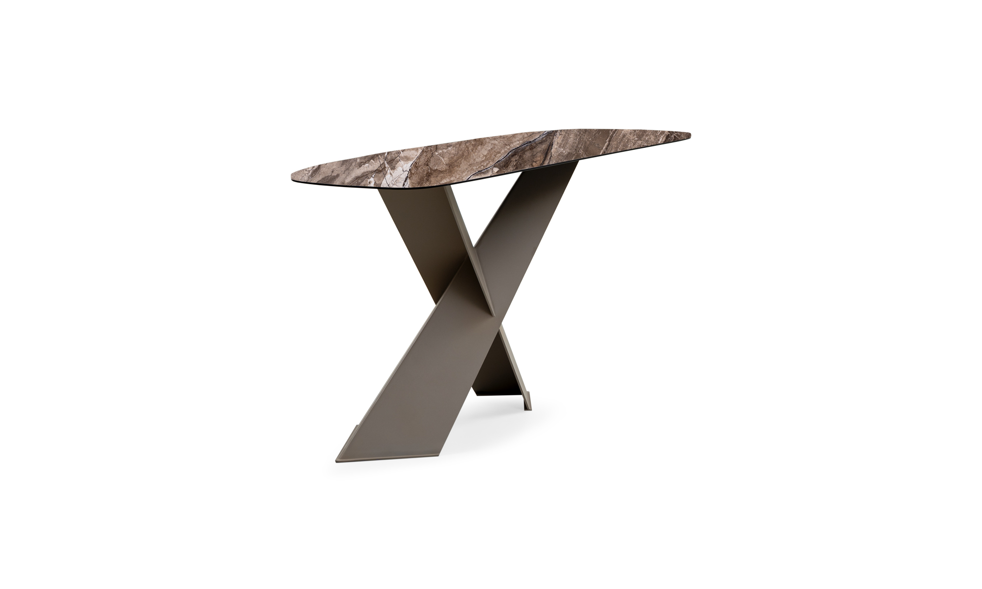 Tapa en cerámica sinterizada, con acabado mate y vetas naturales tipo mármol.- Estructura metálica, pintada en negro y Taupe mate.