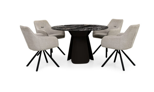 | Madera y pintura | Tapa en cerámica sinterizada, con acabado mate y vetas naturales tipo mármol.- Estructura metálica, pintada en negro y Taupe mate. |
