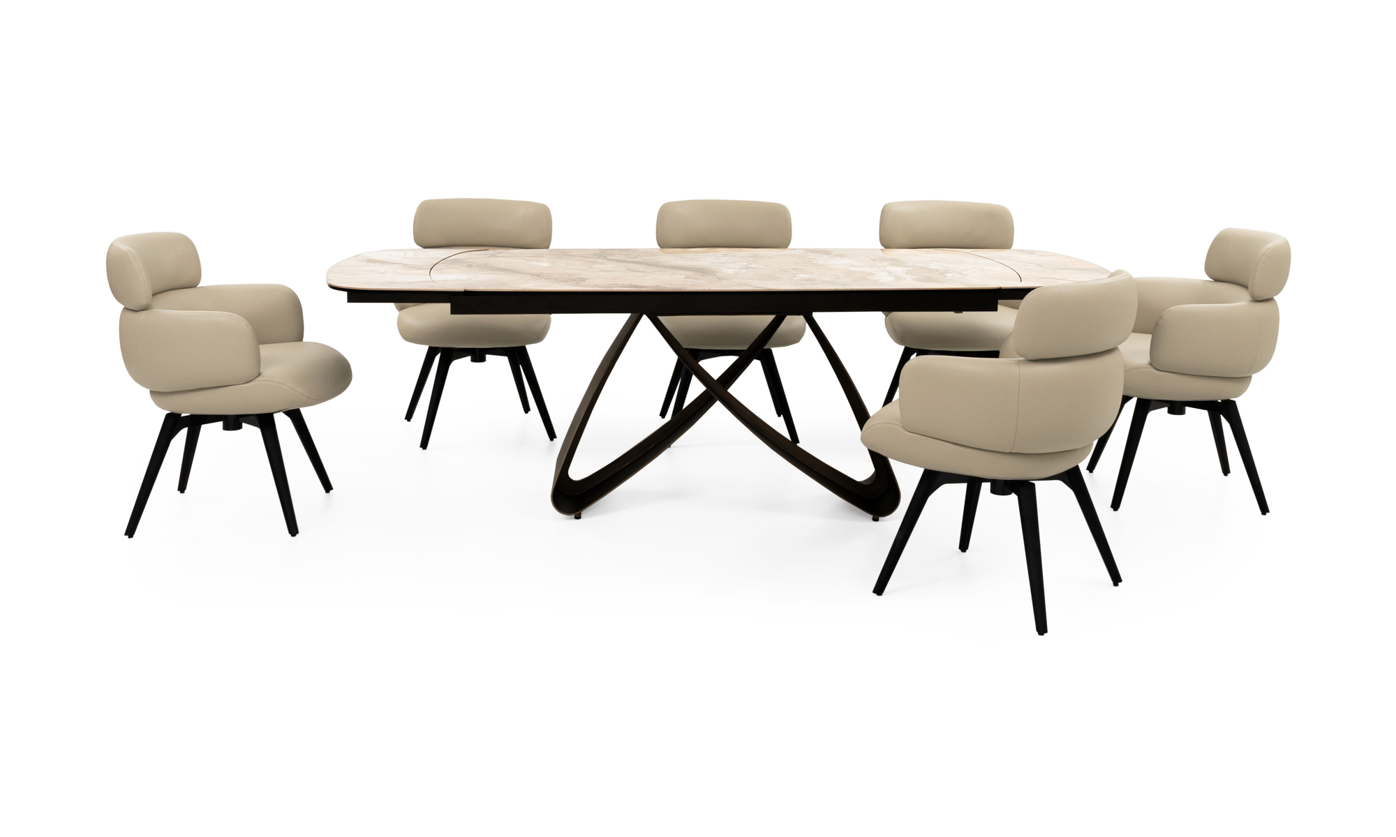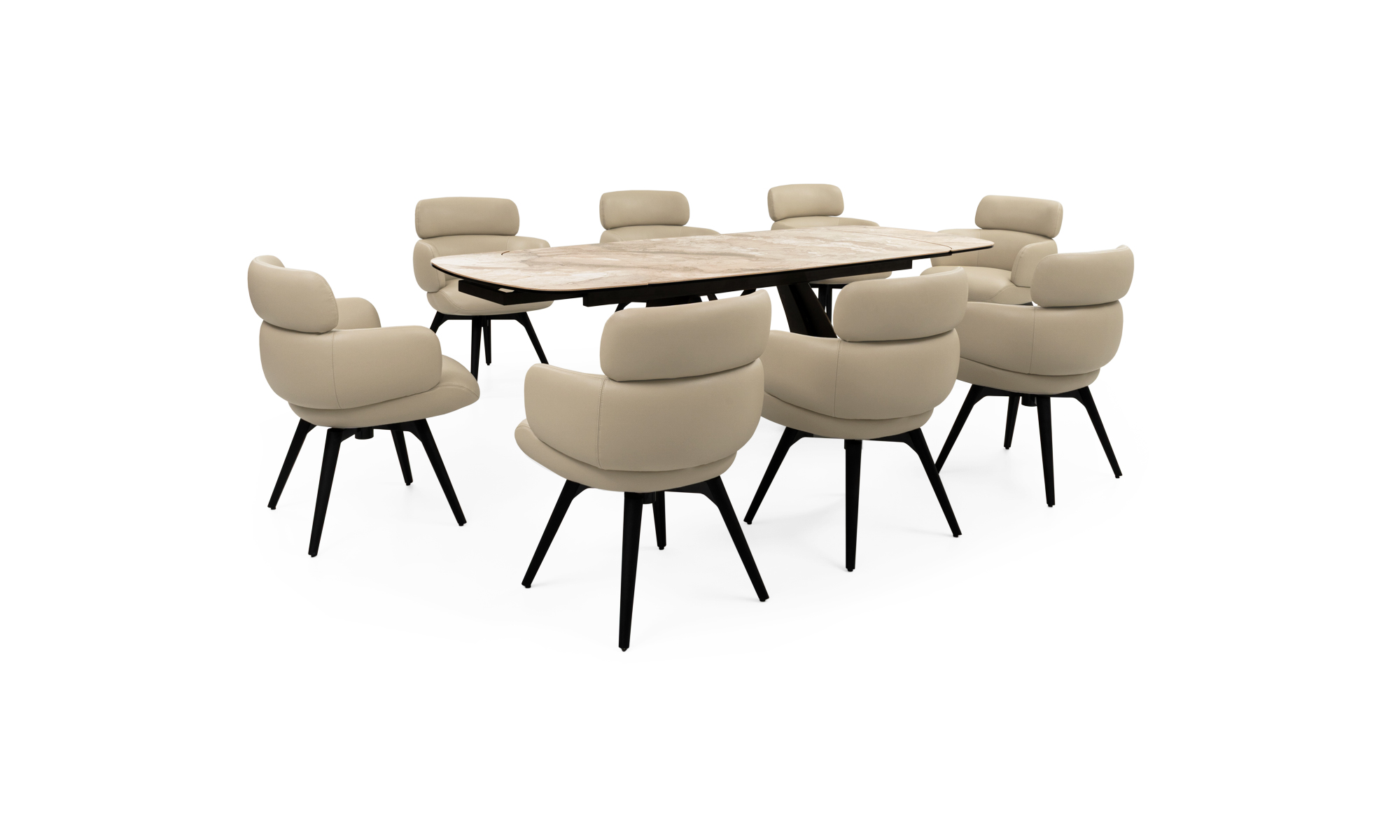 Estructura | Mesa: Tapa en cerámica sinterizada con acabado mate y vetas naturales que simulan la piedra. La tapa es expandible, lo que permite ampliar la superficie de uso de forma práctica y estable. / Base metálica pintada en negro mate o Beige Mate |