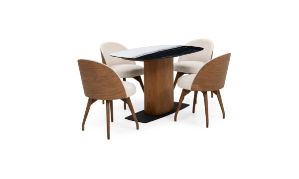 | Estructura | Base en madera sólida Roble Italiano Tapa en cerámica sinterizada, con acabado mate y vetas naturales tipo mármol. |