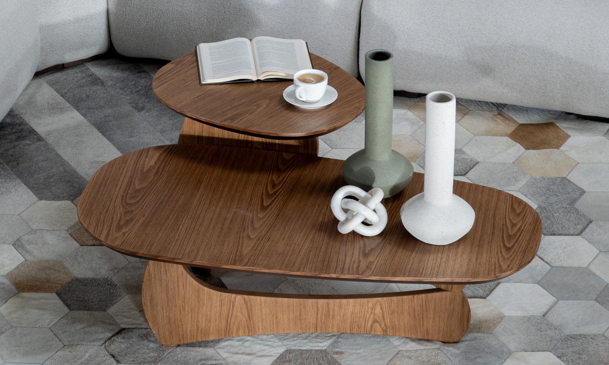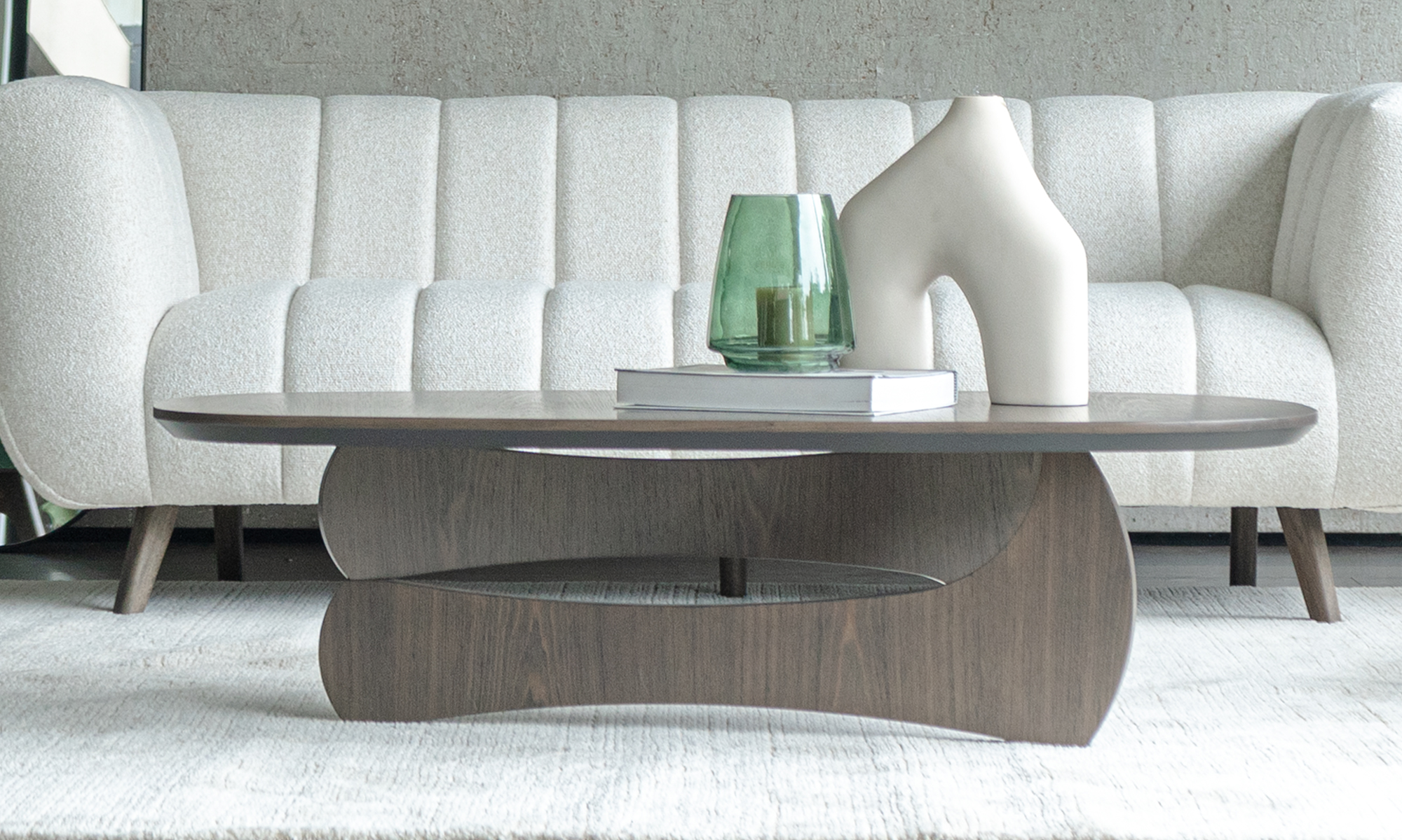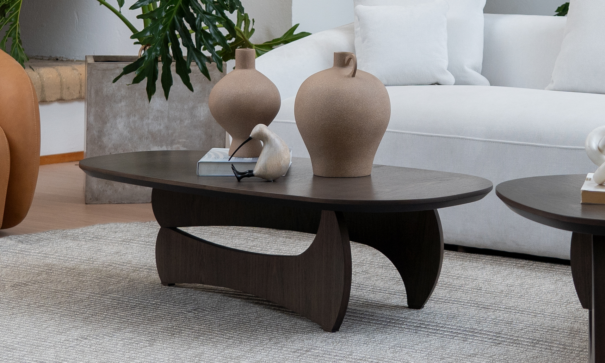 La Mesa de Centro Chelsea destaca por su diseño moderno y funcional. Su superficie ovalada en madera se apoya sobre una base asimétrica robusta, aportando un toque contemporáneo y elegante en cualquier ambiente.