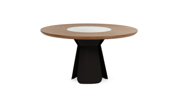 | Madera y pintura | Lámina en Roble Europeo > Estructura en Madera alta densidad > Sellador políester y laca acrílica >Acabado en poro semiabierto./ Centro Giratorio en Mármol color CalacattaGold |