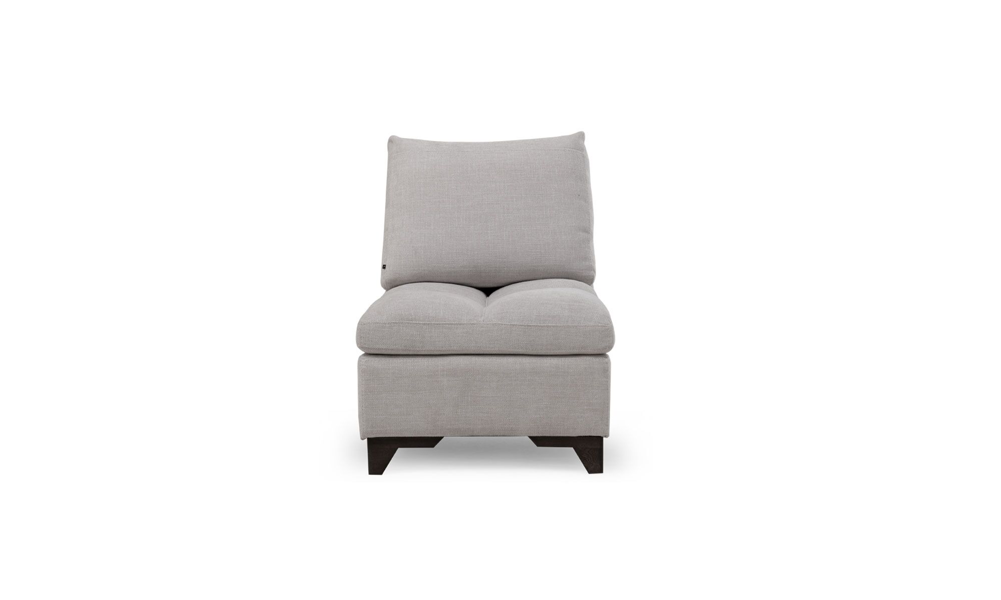 Poltrona Vitaro Plus de la marca Aristas, vista frontal. Presenta un diseño elegante de líneas suaves en un tono neutro. Su respaldo es bajo y está sostenido por patas en madera color Chocolate.
