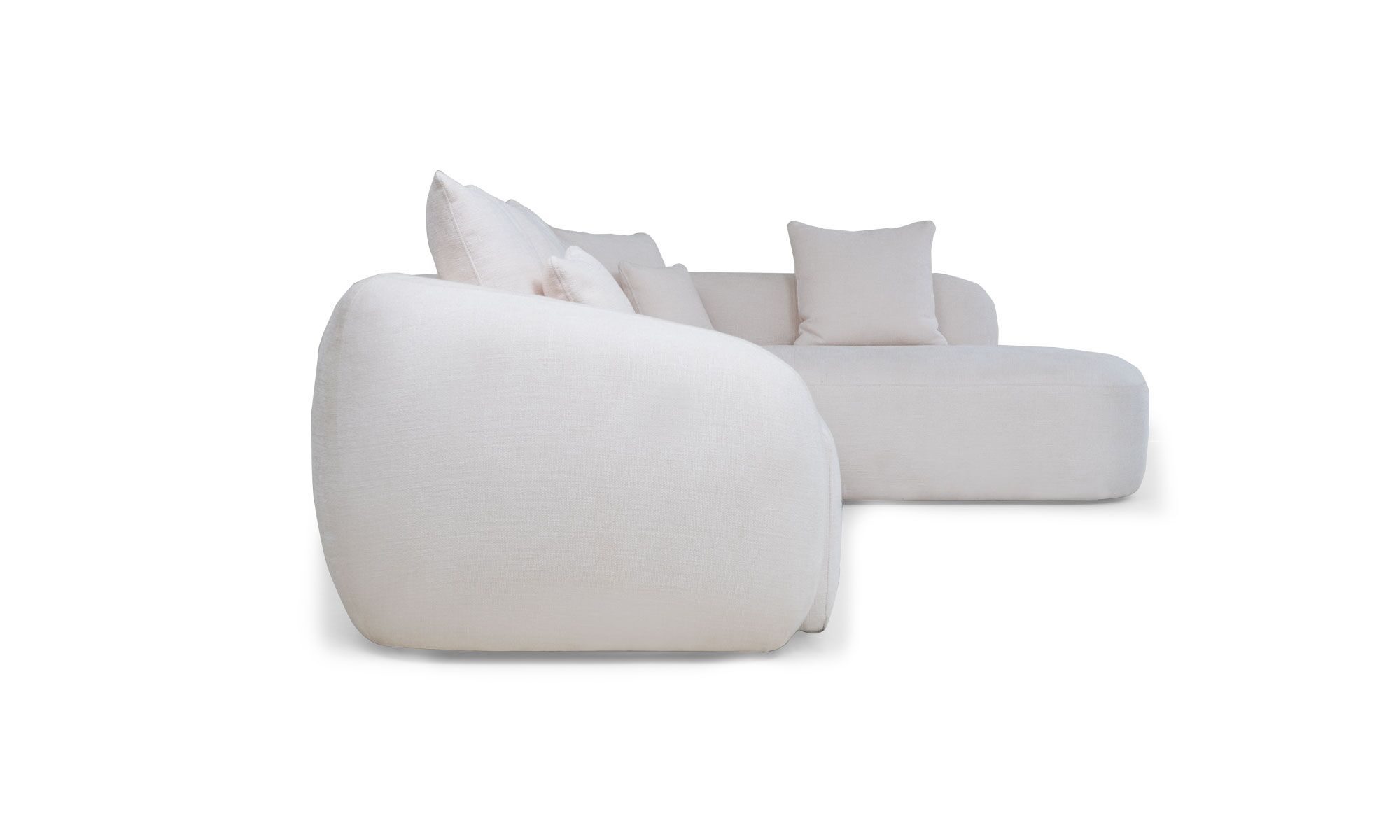 Sala en L Modular Demand de la marca Aristas, vista frontal. Presenta un diseño de líneas limpias y un acabado en tela suave de color Gante Marfil.