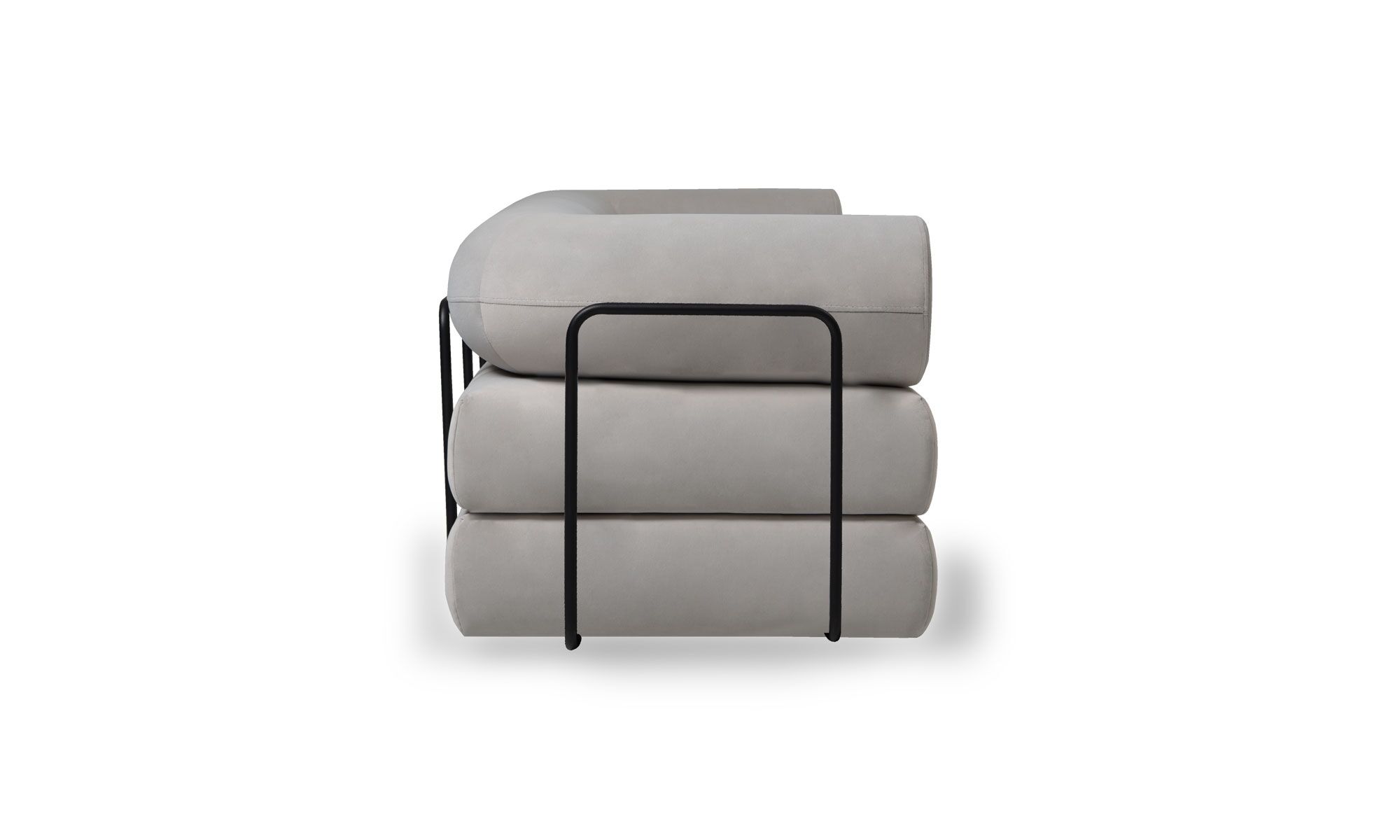 Estructura en madera de pino radiata chileno, inmunizada y secada al horno.Espumas industrializadas de alta densidad, tapizado en telas con altos estándares de calidad en diferentes colores y texturas a su elección. Patas de madera flor morado.